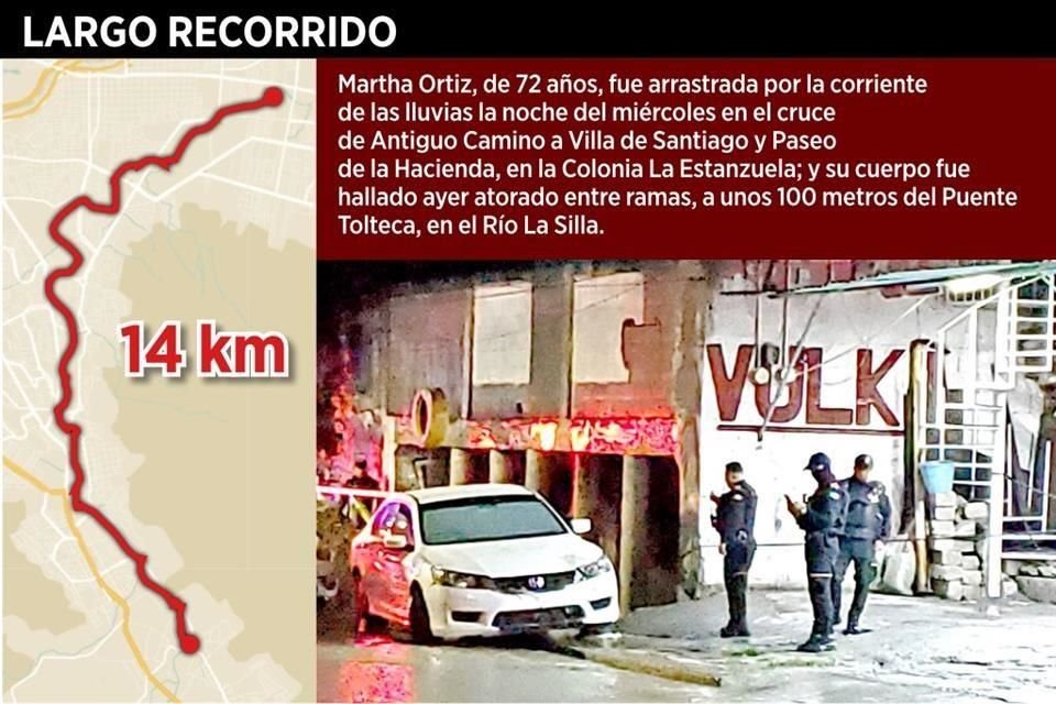 A unos 14 kilómetros de donde la noche del miércoles fue arrastrada por la corriente de las lluvias y donde murió un hombre que trató de rescatarla, una mujer fue encontrada ayer sin vida, en el Río La Silla, en el Parque Tolteca, en Guadalupe.
