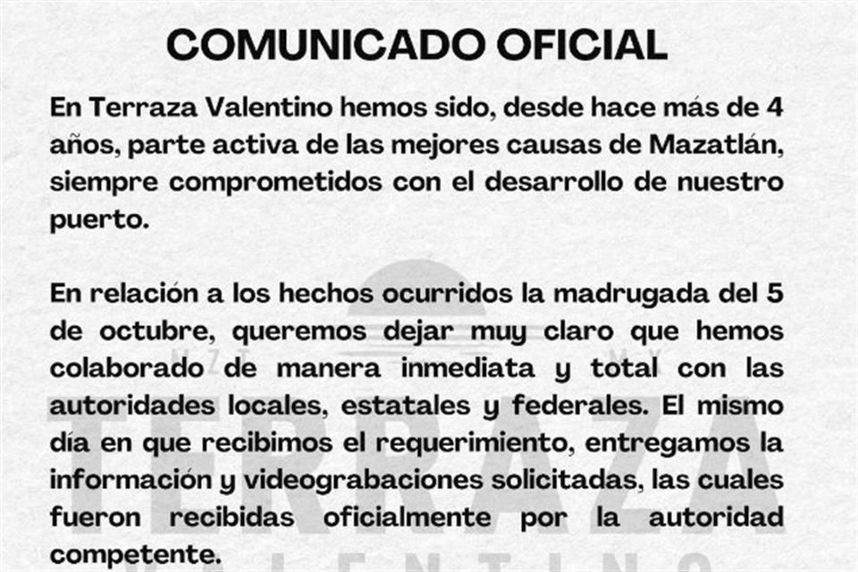 El 12 de octubre, Terraza Valentino aseguró que ha colaborado de manera "inmediata y total" con las autoridades locales y federales.