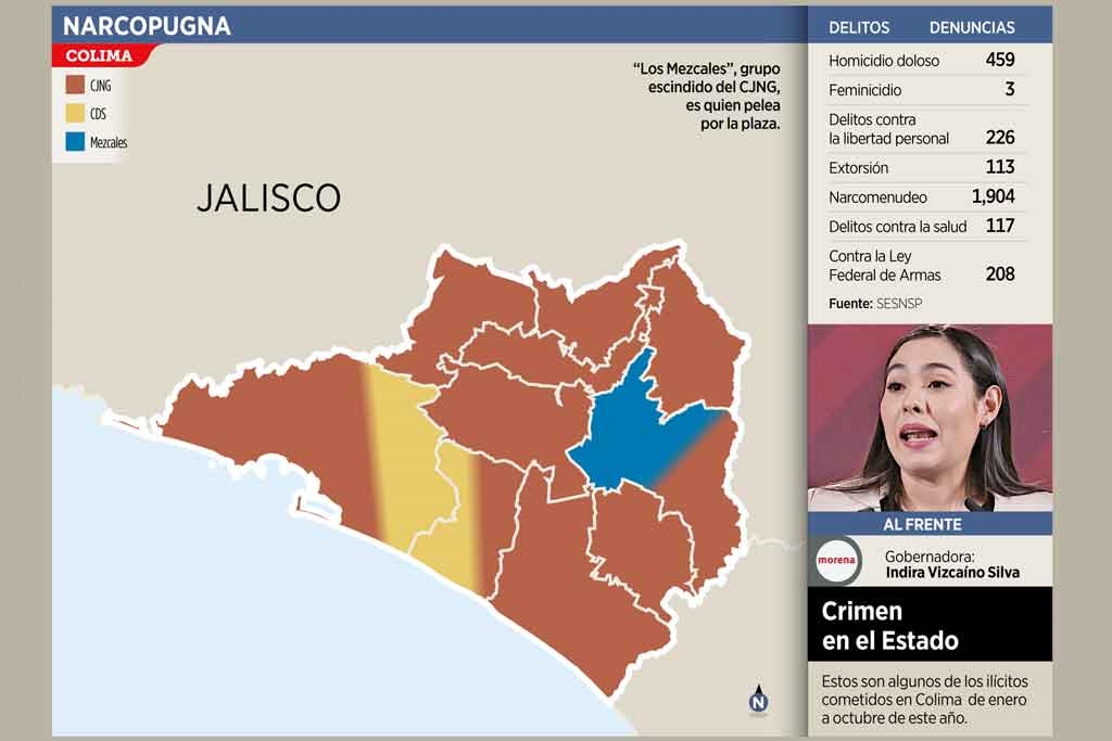 Aunque el CJNG predomina en Colima, desde el 2022 se encuentra en una batalla en contra de "Los Mezcales", un grupo escindido del propio cártel de Nemesio Oseguera Cervantes, "El Mencho".