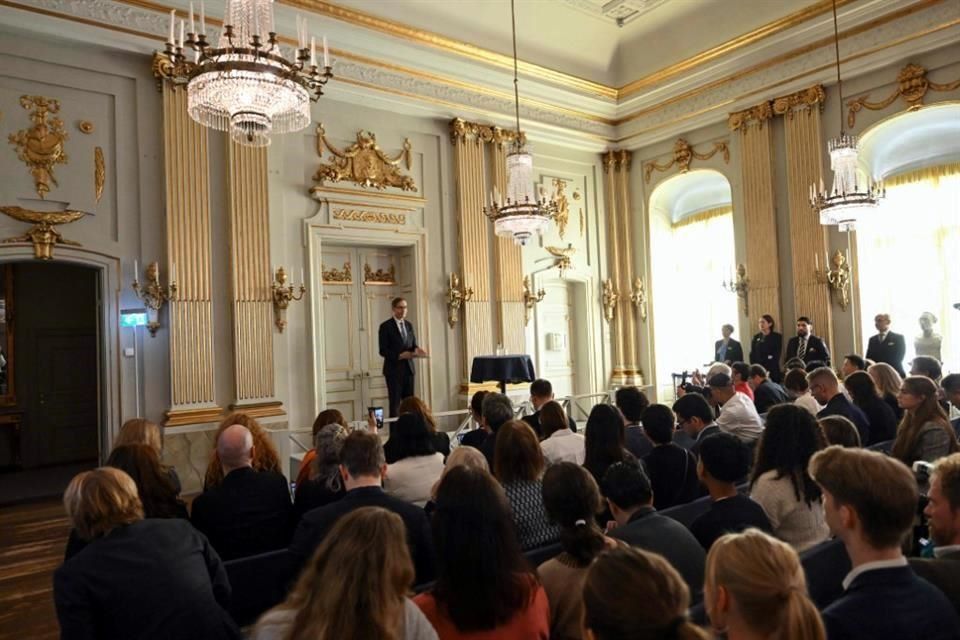 Una vez dado a conocer el nombre de László Krasznahorkai como ganador, la Academia Sueca desplegó los libros que ha publicado en el salón donde se dio el anunció.