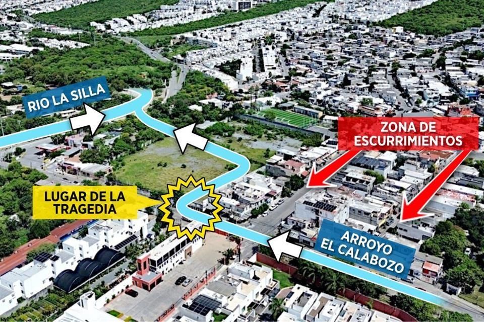 De acuerdo con los vecinos, y durante un recorrido por la zona donde se registró la tragedia, se pudo observar que el agua que escurre del Cerro de La Silla baja principalmente por la Avenida Antiguo Camino a Villa de Santiago.