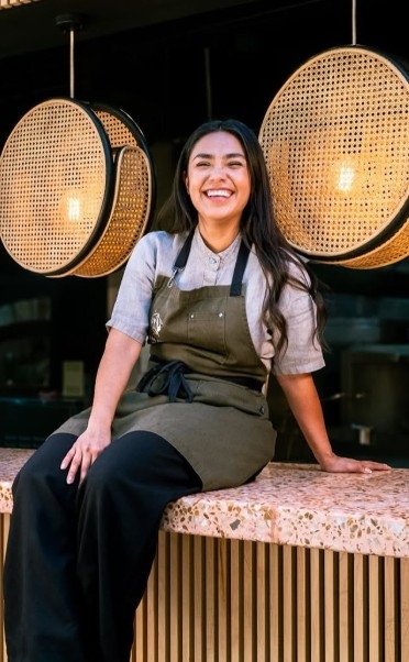 Graduada de la Universidad Autónoma de Baja California (UABC), ha trabajado en cocinas dentro y fuera del País. Su cocina se nutre de vegetales de Finca La Carrodilla y mariscos del Pacífico, reflejando un profundo respeto por el entorno.