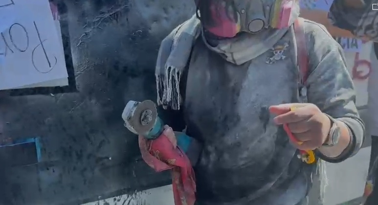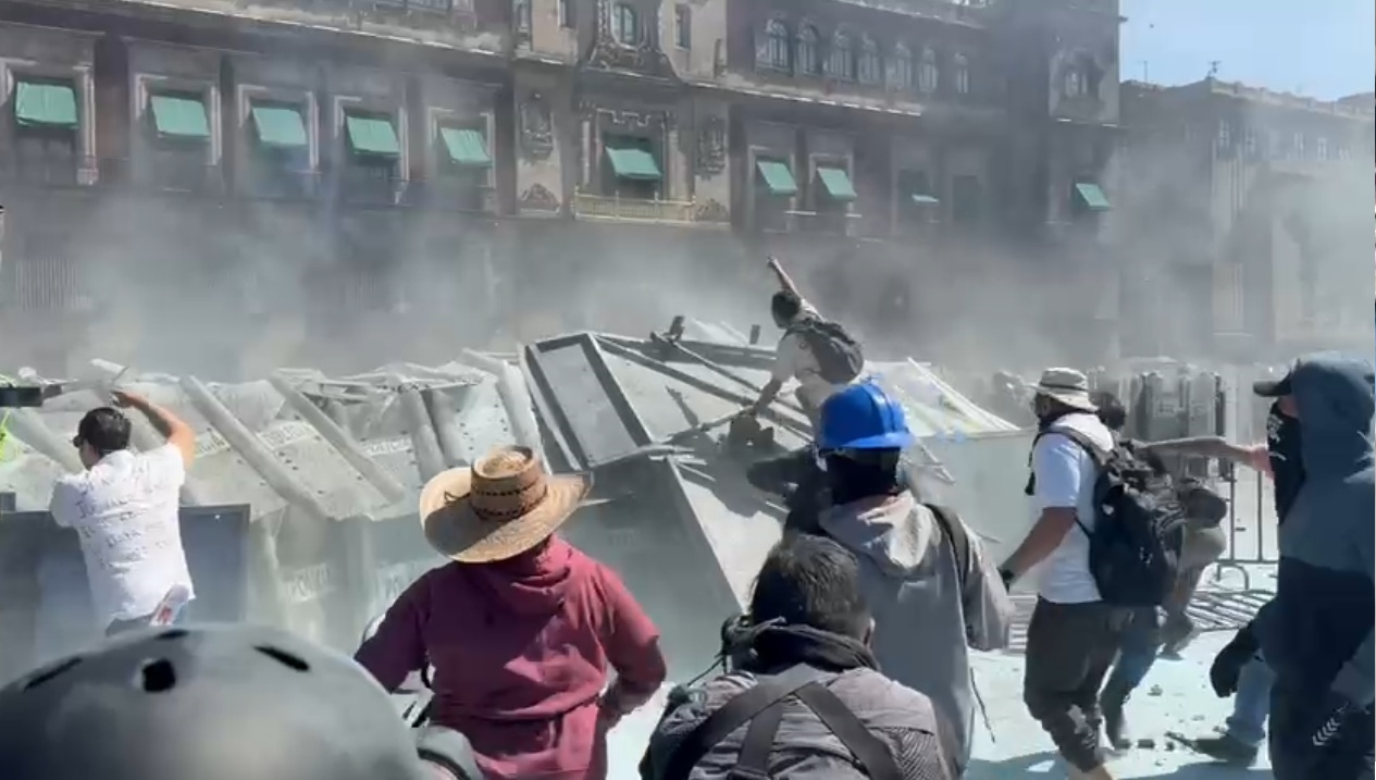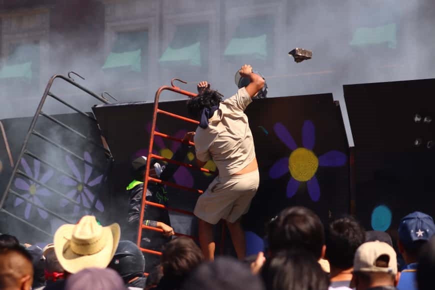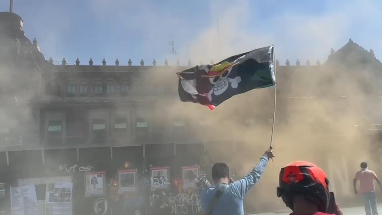 En medio del humo y el descontrol, un joven ondeó una bandera de One Piece, mientras los manifestantes continuaban con los intentos por derribar las vallas y algunos otros intentaban escalar las cercas.