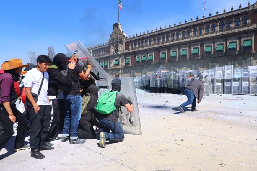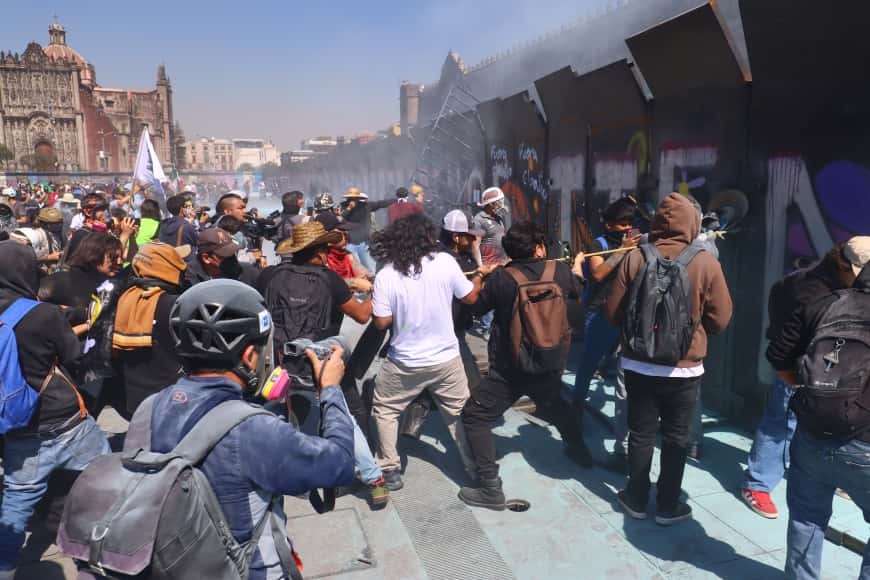 Un grupo de personas con los rostros fue el que comenzó los intentos por tratar de derribar las vallas que resguardaban el Palacio Nacional, mientras los policías respondieron con extintores desde el otro lado del recinto.