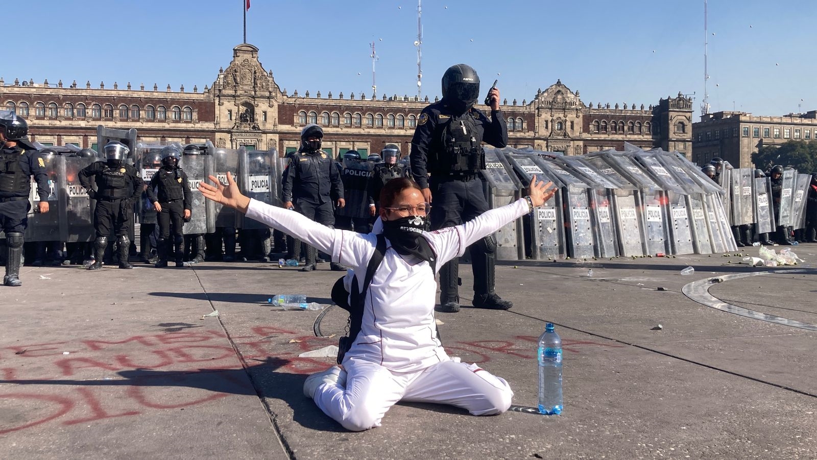 En una de las disputas, un policía fue captado golpeando con su escudo a una persona tendida en el suelo, pero el hecho cesó cuando una joven de personal de salud se interpuso entre ambos bandos.
