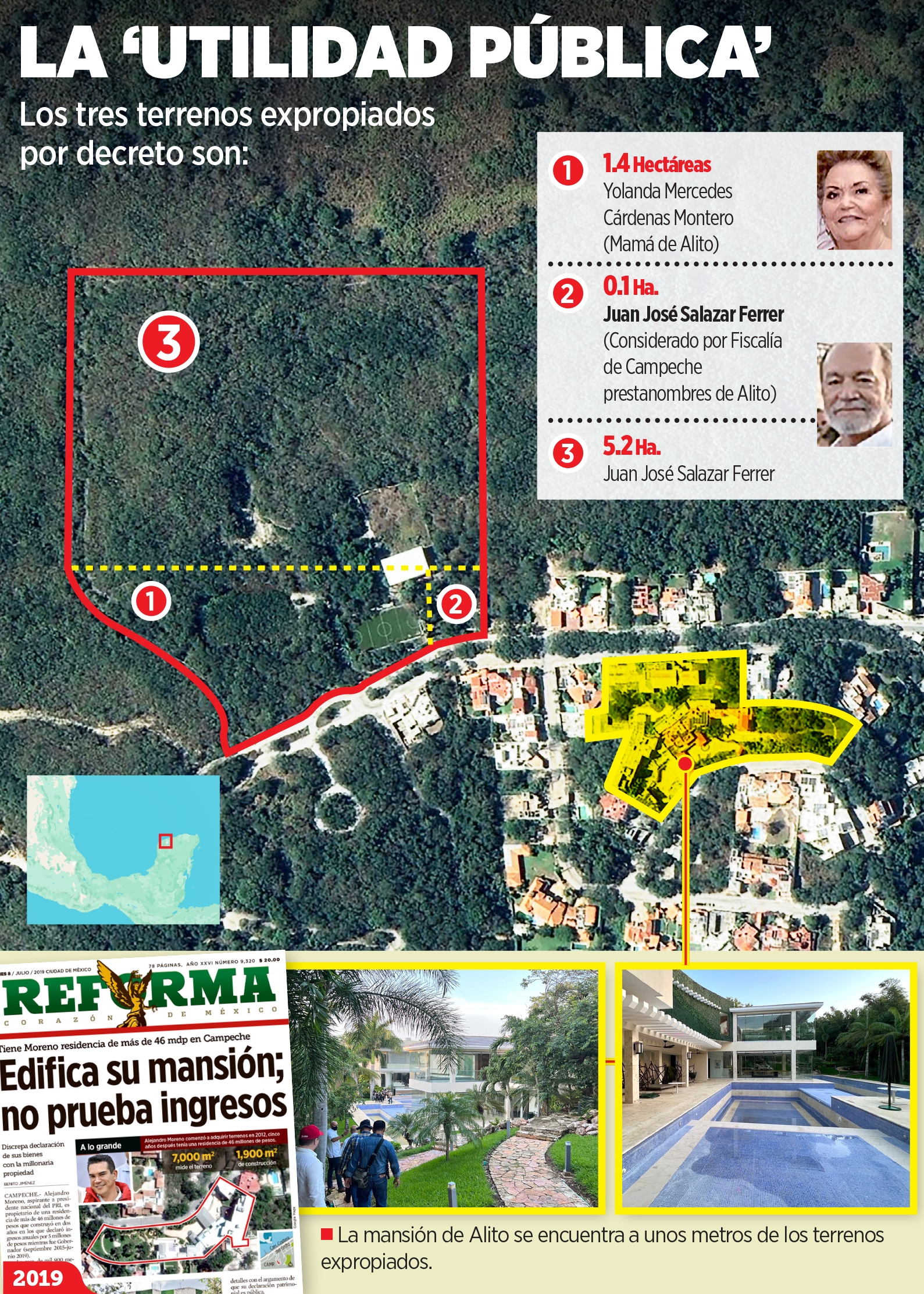 El decreto considera un predio de 1.4 hectáreas que se encuentra a nombre de Yolanda Mercedes Cárdenas Montero, madre del líder priista. También otros dos predios registrados a nombre de Juan José Salazar Ferrer, arquitecto y quien es señalado por el gobierno morenista como presunto prestanombres de "Alito". Un terreno es de mil 111 metros cuadrados y otro de 5.2 hectáreas.