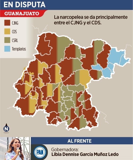 Derivado de la pugna que ostentan, el grupo con mayor predominio es el CJNG (con 31 Municipios), seguido del CSRL (con 10), y con hegemonía en la región Laja-Bajío.