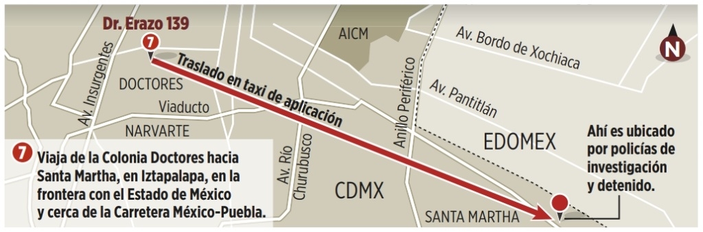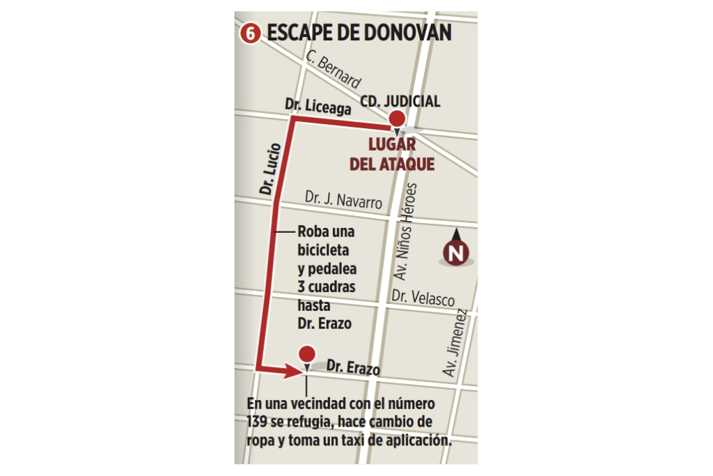 De acuerdo con las pesquisas, Donovan robó una bicicleta minutos más tarde. En ella se dirigió a la vecindad, donde se refugió por unos minutos, se cambió de ropa y, posteriormente, salió para abordar un taxi de aplicación con rumbo a Iztapalapa.