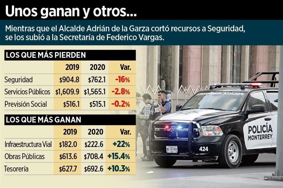 Aunque ha estado insistiendo en asumir el control total de la vigilancia en el municipio, que hasta ahora comparte con el Estado, el Alcalde priista de Monterrey, Adrián de la Garza, redujo un 16 por ciento el presupuesto de la Secretaría de Seguridad Pública y Vialidad para el próximo año.